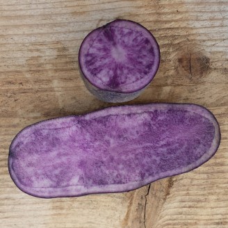 Particulièrement appréciée pour la qualité de sa chair, cette pomme de terre à peau et chair violette produit de nombreux tubercules longs et réguliers. Après cuisson, la couleur bleue devient uniforme. Elle se prêtera très bien à une cuisson en gratin ou à la vapeur.