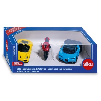 Porte de garage relevée. Cette vision émoustillera les amateurs de voitures rapides et de motos : une Porsche 918 Spyder, une Ducati 1299 Panigale et une Bugatti Chiron soigneusement alignées. Alors, que prendrez-vous pour sortir aujourd'hui ? Avec le coffret cadeau Voiture de sport et moto, ce rêve que font beaucoup de petits et grands enfants devient réalité pour une somme modique. La Porsche 918 Spyder est une des voitures les plus rapides et les plus convoitées d'Allemagne. Seuls 918 modèles ont été construits. 887 CV générés par un moteur V8 4,6 litres et deux moteurs électriques permettent à la sportive hybride d'accélérer à 100 km/h en 2,6 secondes et d'atteindre une vitesse maximale de 345 km/h. La Bugatti Chiron n'est pas moins spectaculaire. Quatre compresseurs turbo alimentent le puissant moteur 16 cylindres disposés en W. Le résultat : une puissance surréaliste de 1 500 CV et une vitesse maximale de 420 km/h. Le modèle miniature affiche des couleurs voyantes avec une peinture bleu clair et noir mat. Les larges portes invitent à monter et à démarrer. L'expérience de la vitesse avec la Ducati 1299 Panigale s'avère bien plus brutale, mais pas moins intense. Le moteur bicylindre de la supermoto italienne génère 205 CV. Ainsi, la spécialiste de la course sur route originaire de Bologne atteint une vitesse de pointe de 299 km/h. Afin de pouvoir admirer à l'envi son design et ses couleurs (rouge classique et tricolore), la miniature est équipée d'une béquille escamotable.